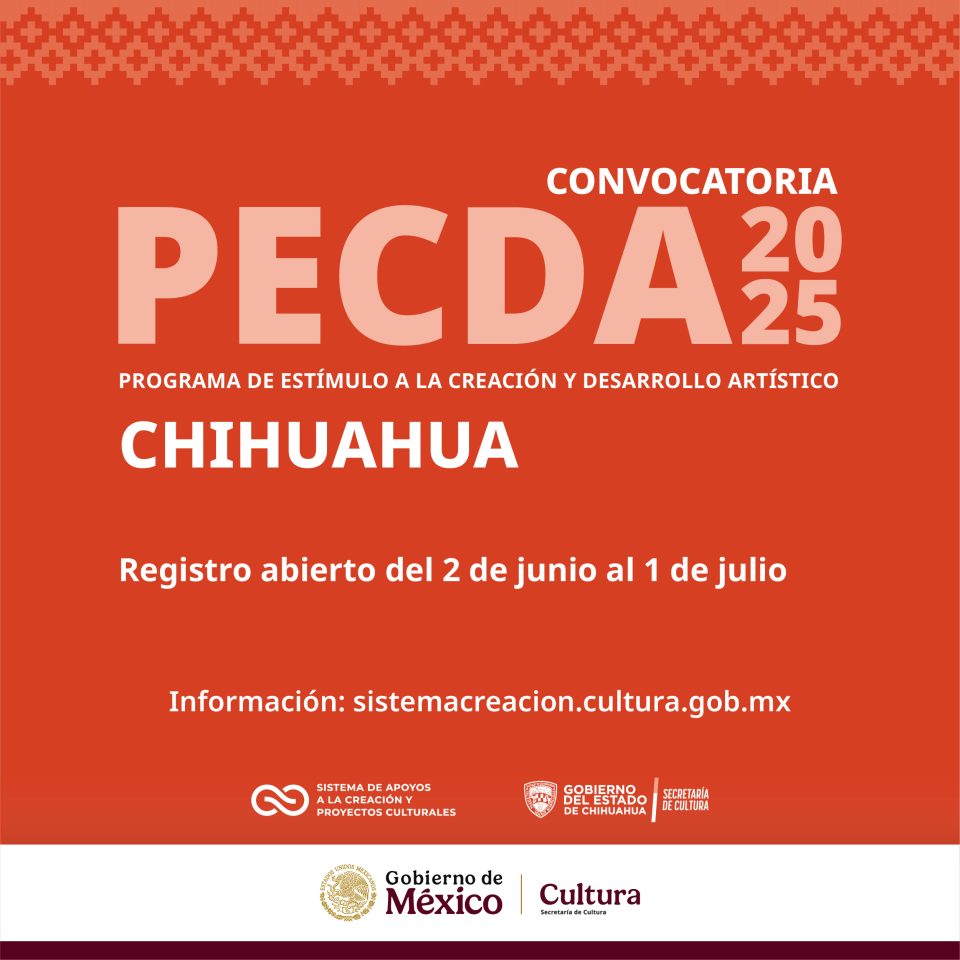 Chihuahua, Chih. – La Secretaría de Cultura del Gobierno de México, a través del Sistema de Apoyos a la Creación y Proyectos Culturales, en coordinación con el Gobierno del Estado, invita a la comunidad artística a participar en la convocatoria 2025 del Programa de Estímulo a la Creación y Desarrollo Artístico (PECDA) Chihuahua.