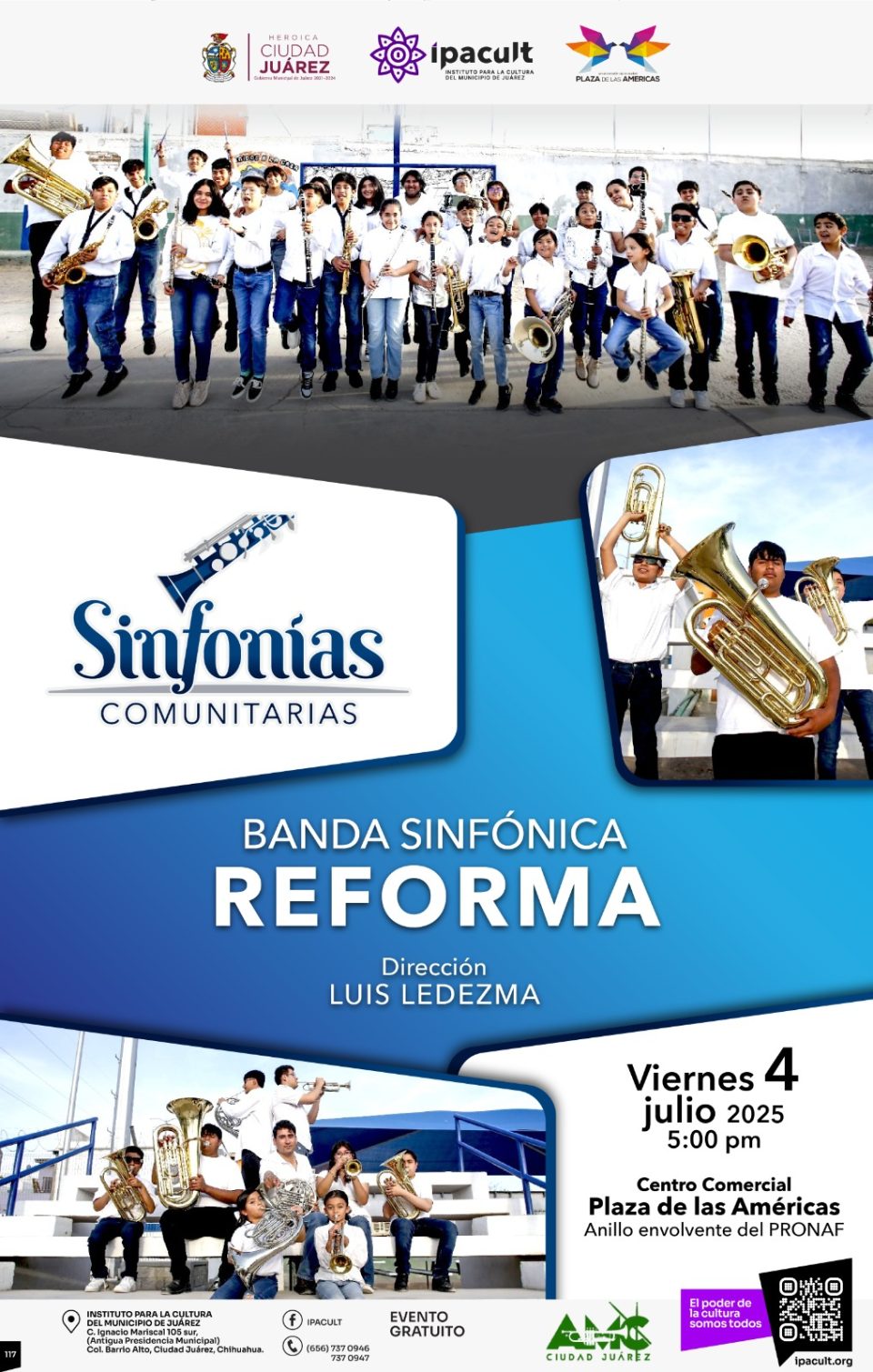 Ciudad Juárez.- El Instituto para la Cultura del Municipio de Juárez (IPACULT) invita a la ciudadanía a disfrutar del concierto que ofrecerá la Banda Sinfónica Reforma este viernes 4 de julio a las 5:00 de la tarde, en el interior del centro comercial Plaza de las Américas.