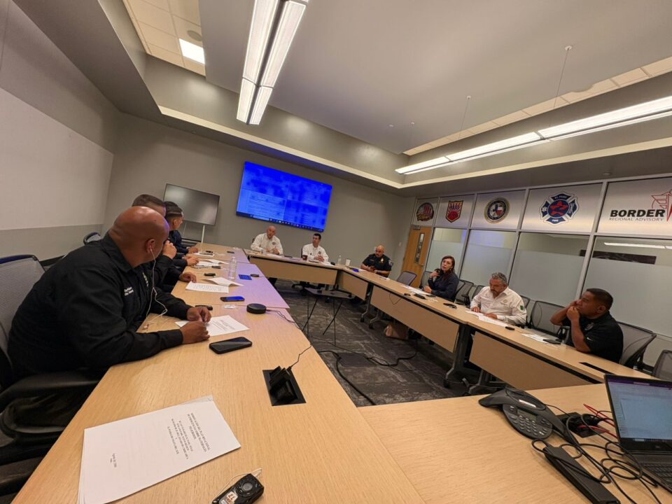 El Paso, Texas. – Con el propósito de fortalecer la cooperación transfronteriza en materia de seguridad y atención a emergencias, el director general de Protección Civil, Sergio Rodríguez, participó en una reunión de trabajo en el Centro Regional de Comunicaciones de El Paso, Texas, junto con jefes de departamento y encargados de área de la dependencia.
