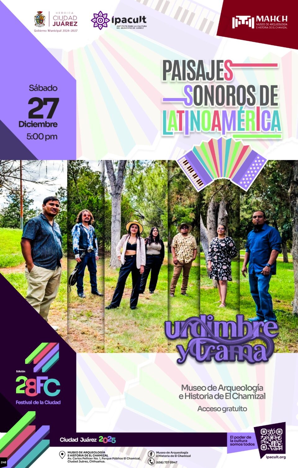 Ciudad Juárez, Chih. – El Instituto para la Cultura del Municipio de Juárez (IPACULT) invita al público a la presentación del grupo musical Urdimbre y Trama, como parte de la exposición “Paisajes Sonoros de Latinoamérica”, que se llevará a cabo mañana sábado 27 de diciembre a las cinco de la tarde, en el Museo de Arqueología e Historia de El Chamizal.