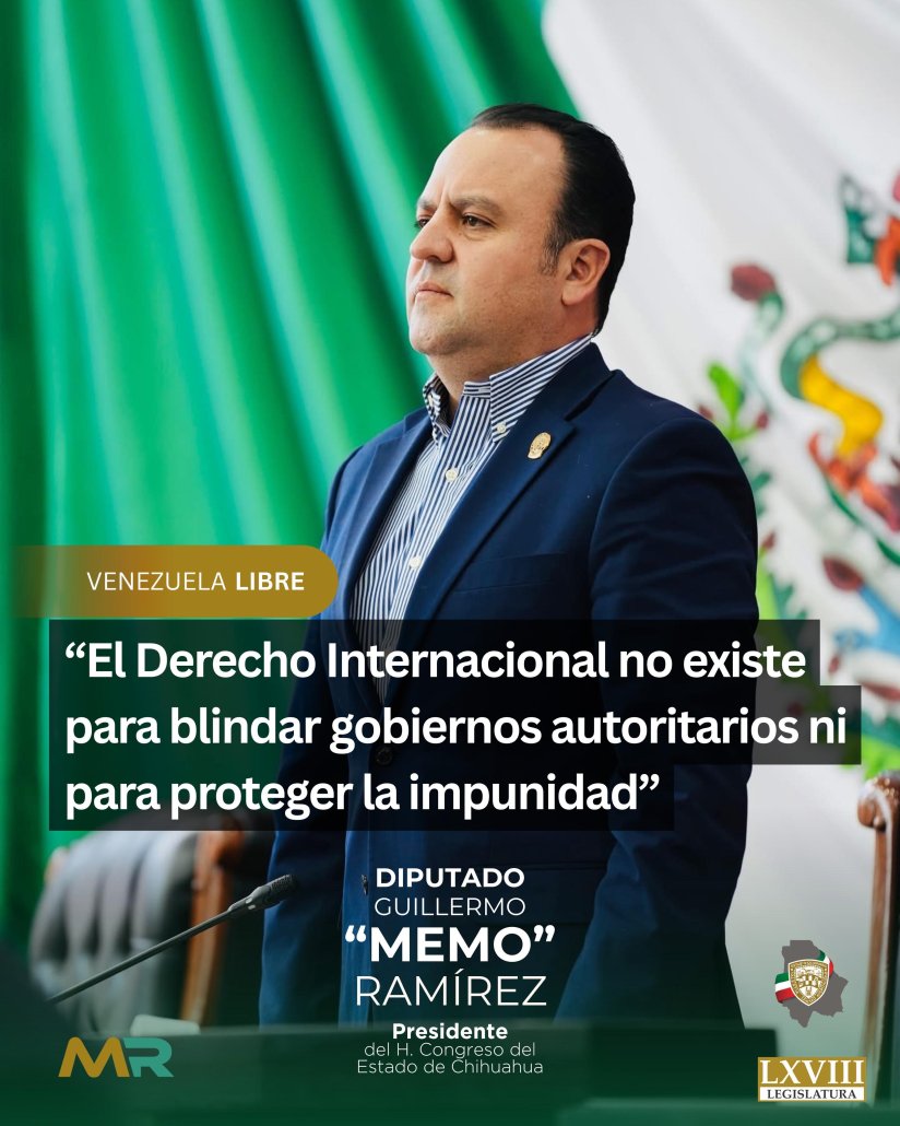 Chihuahua, Chih. – El diputado Guillermo Patricio Ramírez Gutiérrez, presidente del H. Congreso del Estado, emitió una declaración en la que estableció una postura clara y firme desde la perspectiva del derecho internacional frente a la situación que enfrenta Nicolás Maduro.